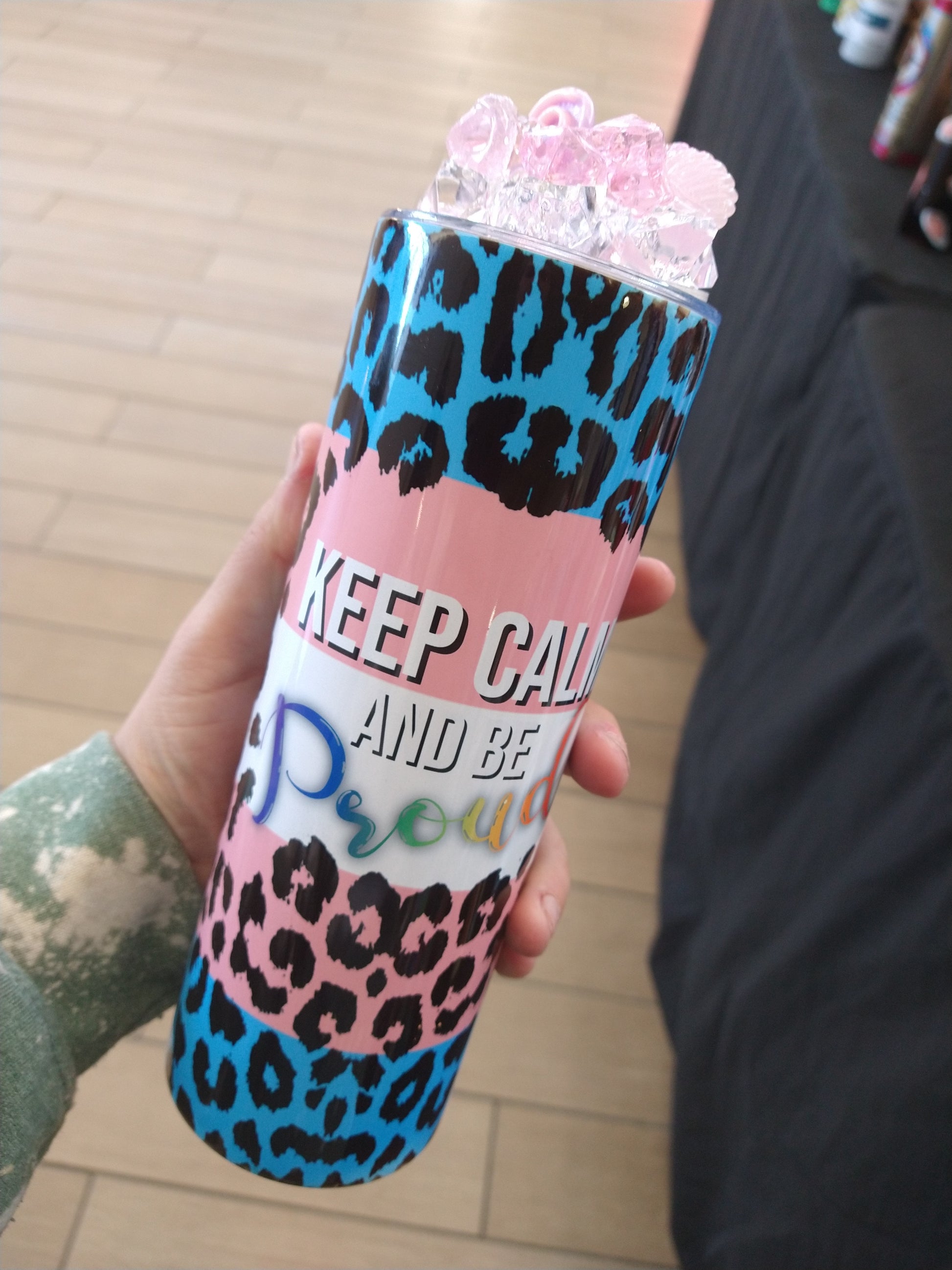 20 oz Be Proud Stainless steel tumbler. This piece comes with a magnetic Ice Topper . As well as a 10.5 inch straw.