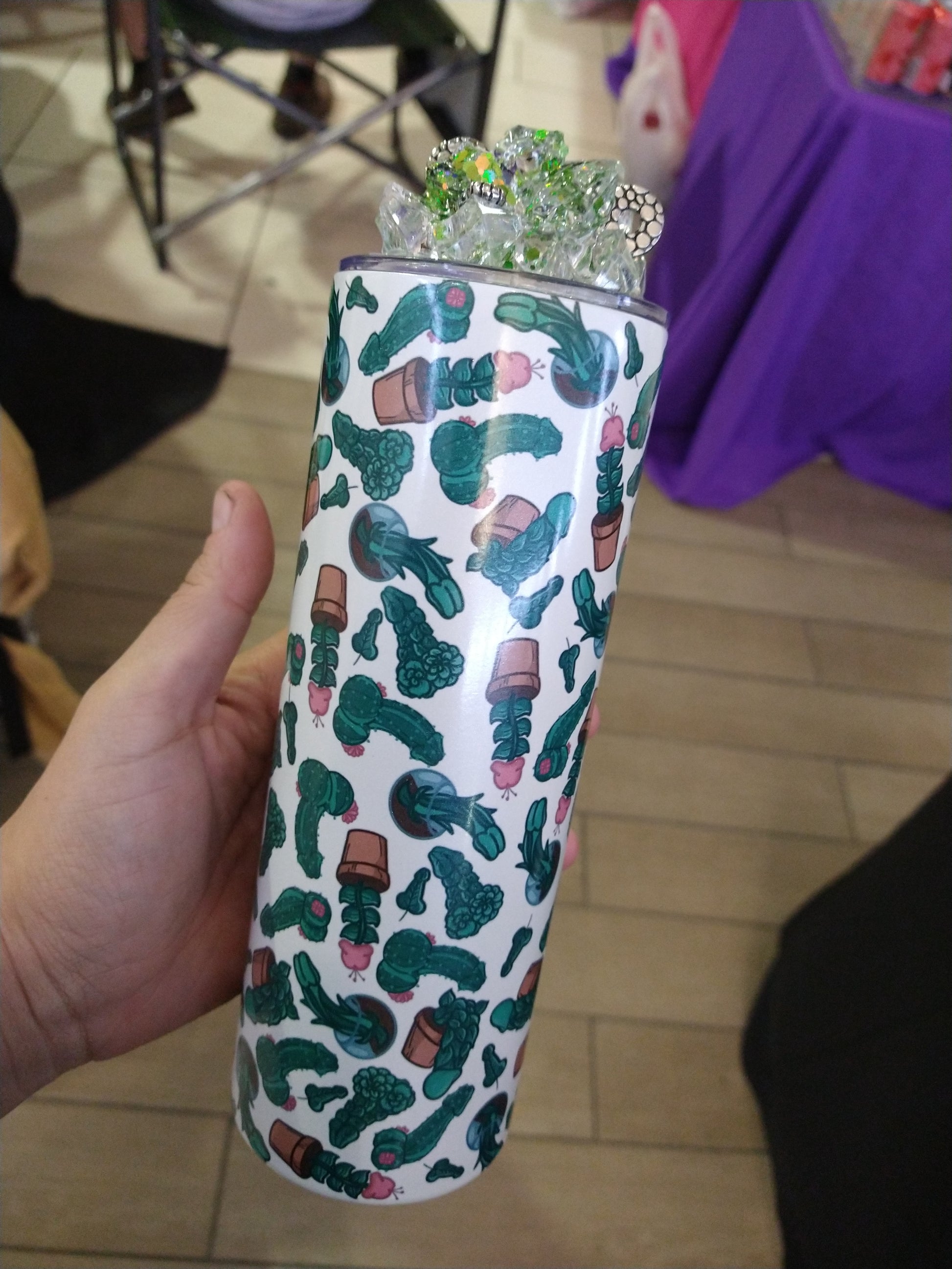 20 oz stainless steel tumbler. With magnetic ice topper that is removeable for cleaning. Also fits most skinny 20 oz tumblers.