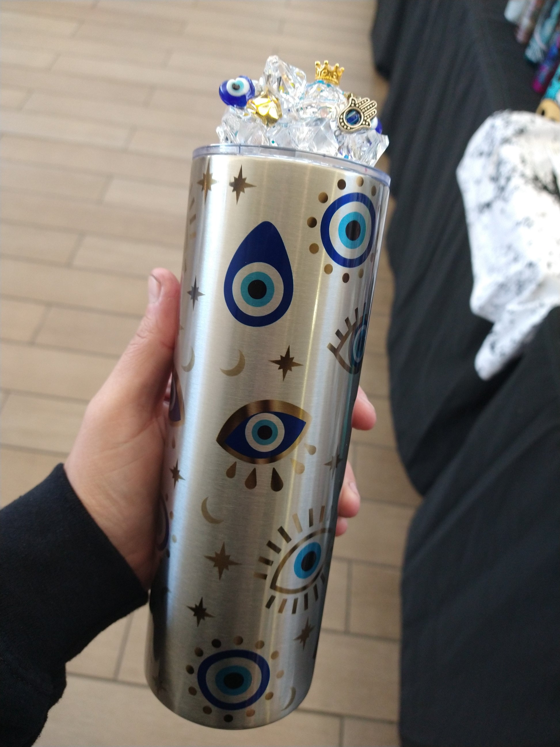 20 oz Stainless steel tumbler. This piece comes with a magnetic Ice Topper . As well as a 10.5 inch straw.