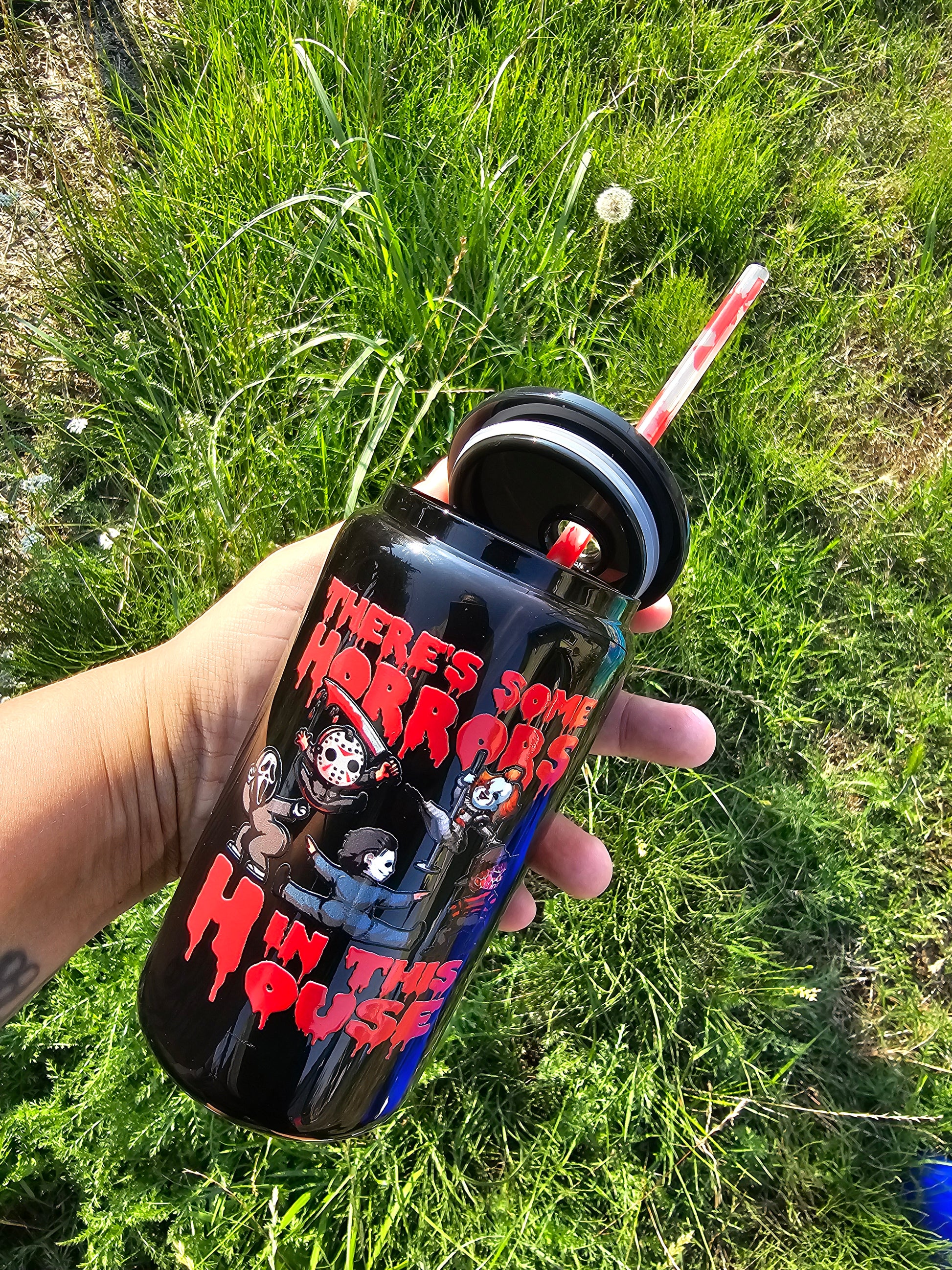 Get ready to sip in spooky style with our Horrors In This House GlassTumbler! This 16 oz tumbler features a fun and playful design that will have you screaming for more. Perfect for Halloween parties or adding some creepy charm to your daily routine. Don't miss out on this hauntingly delightful addition to your drinkware collection.
