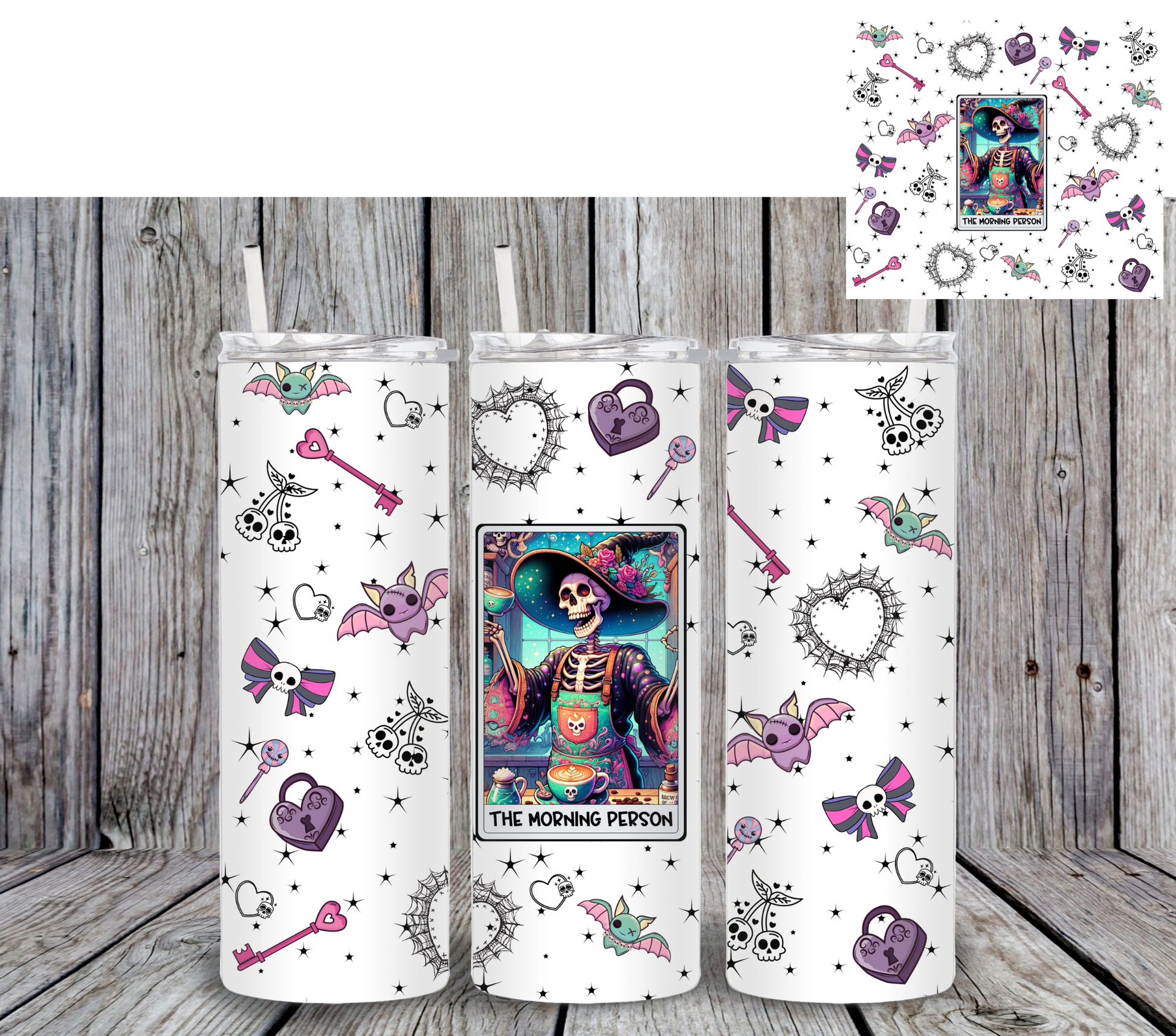 Start your day off right with the Morning Person Tumbler! This 20 oz stainless steel tumbler is perfect for keeping your favorite beverage hot or cold. Its playful design is perfect for those who embrace their inner morning witch. No need for a broomstick, this tumbler has got you covered!