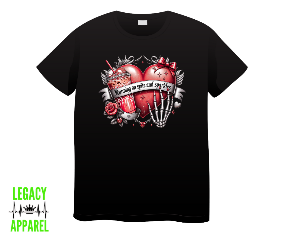 Show off your playful side with our Running On Spite and Sparkles T-Shirt! Perfect for someone who doesn't take themselves too seriously, this quirky shirt features a unique design and a touch of humor. Wear it while running or just for fun - either way, you'll be sure to turn heads with this statement piece.